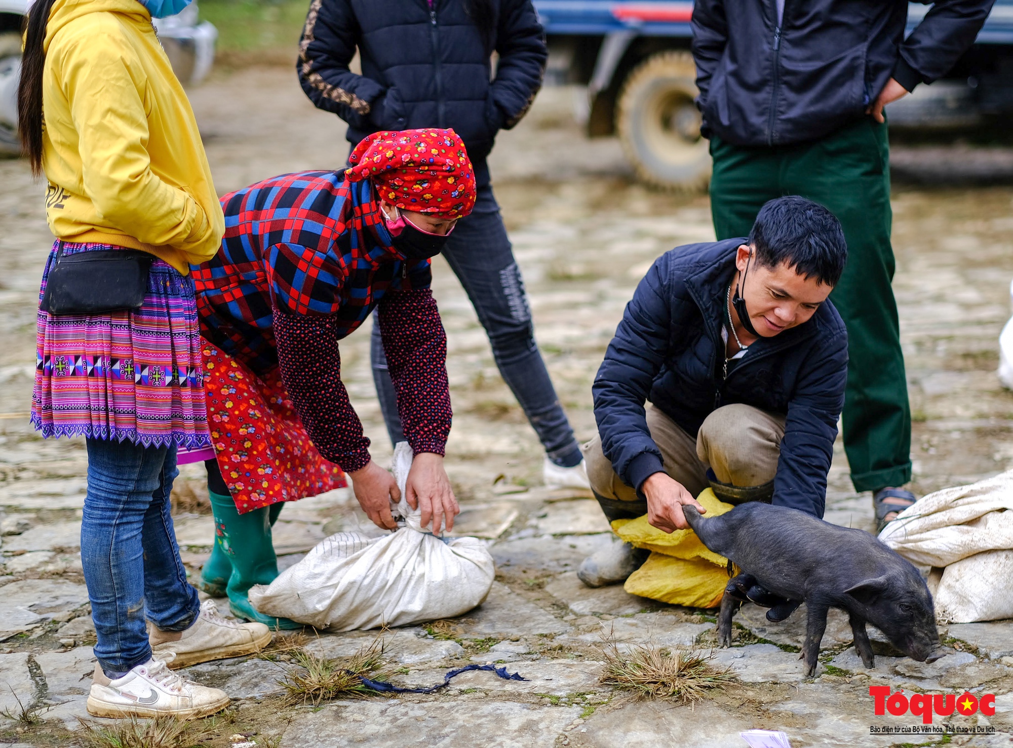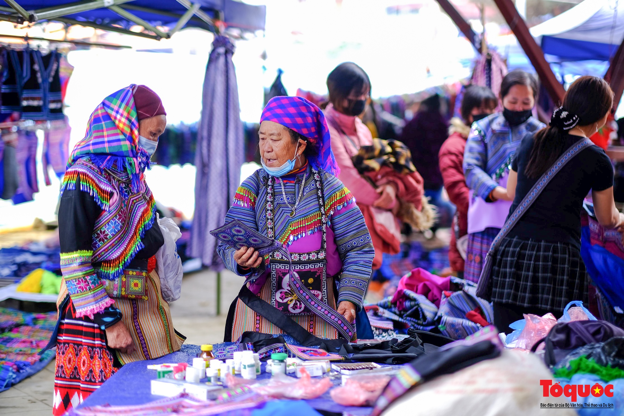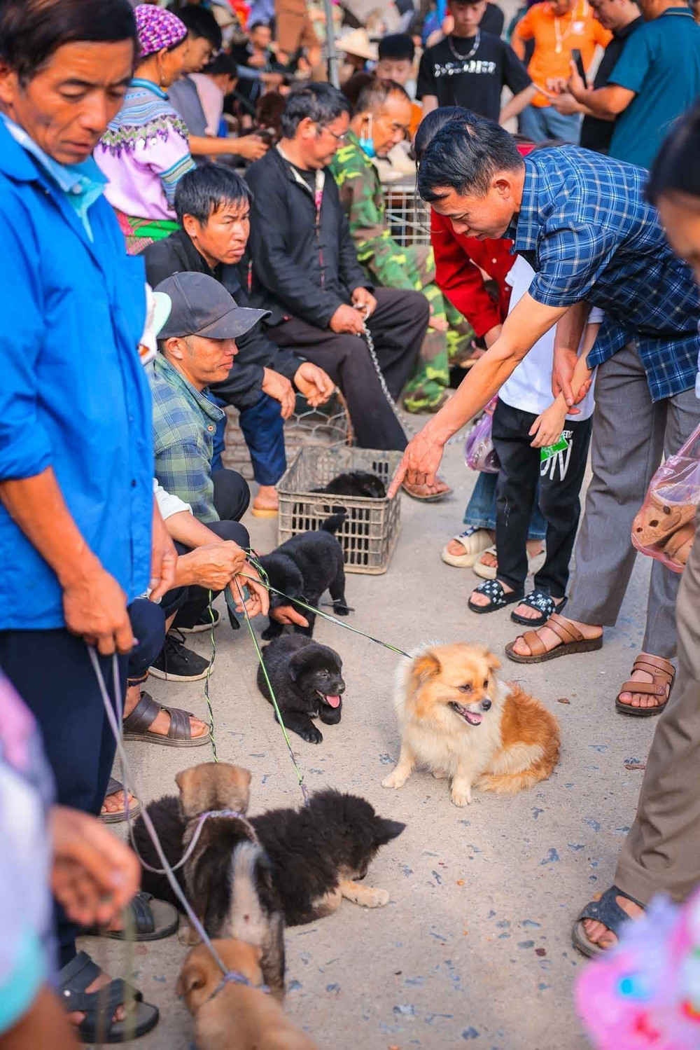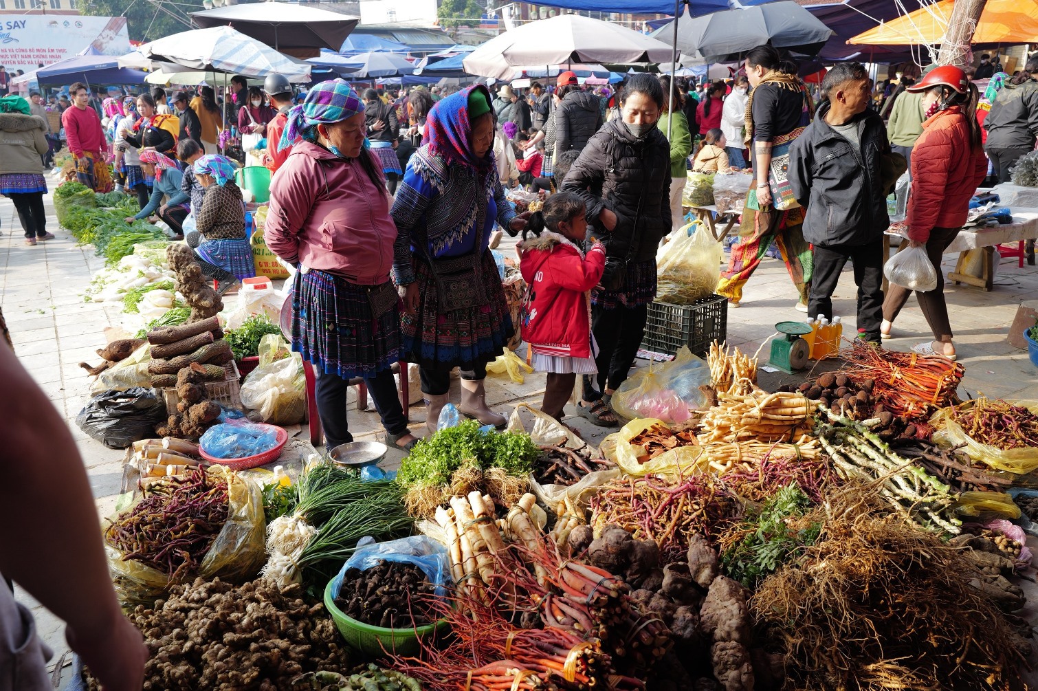 The market is so big that it is already packed with people. The Mong, Lo Lo, and Red Dao ethnic groups gather together, wearing colorful dresses. On Sundays, the mothers and grandmothers wear their most beautiful dresses, the girls of marriageable age also wear beautiful dresses, and the boys and girls with red cheeks from the cold are also dressed beautifully. Going to the market only once a week, everyone wants to show off the dresses made by their own skillful hands. The whole market turns into a brilliant flower market.
