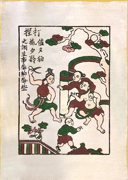 Family relationships are one of the topics reflected in the paintings that are quite profound and witty. Under feudalism, men were allowed to have "five wives and seven concubines". This polygamy regime created inevitable family conflicts. "Jealousy" (Đánh ghen) is a typical Dong Ho folk painting of this topic.