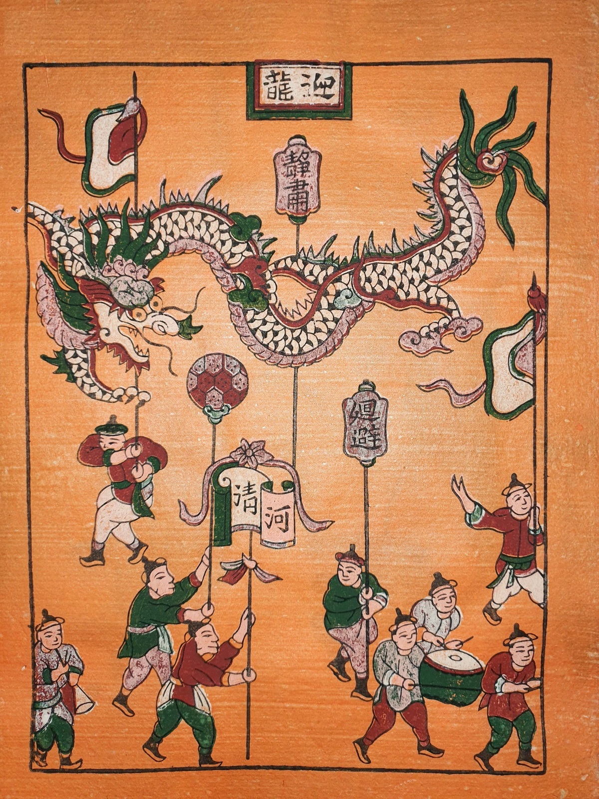 The Dragon has become a mascot of the Vietnamese people for years that is associated with the fairy tale of “The Dragon and the Fairy” of the Vietnamese nation. The Dragon is also a symbol and represents both the authority of nature as well as in society. The painting shows a scene of a dragon dance during the Spring Festival.