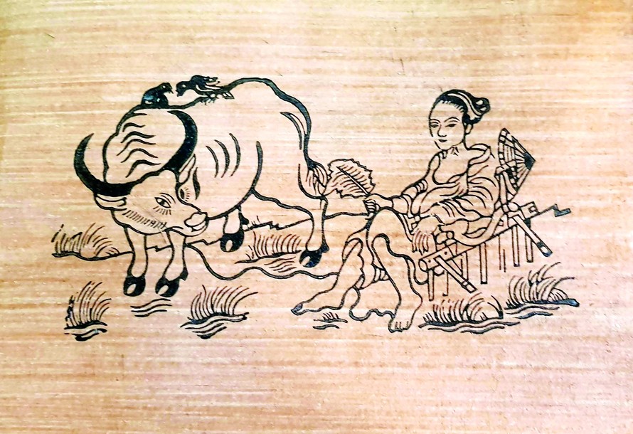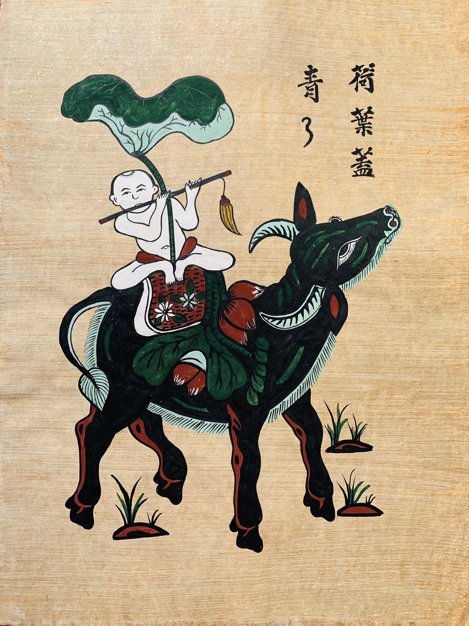 The painting "Buffalo herding and flying kites" (Chăn trâu thổi sảo) is the image of a boy lying on his back on the back of a buffalo and flying a kite. The buffalo in the painting has its front legs lifted up as if it wanted to fly with a kite. The parasol and belly are full, representing the farmer's wish for a peaceful life full of blessings.
