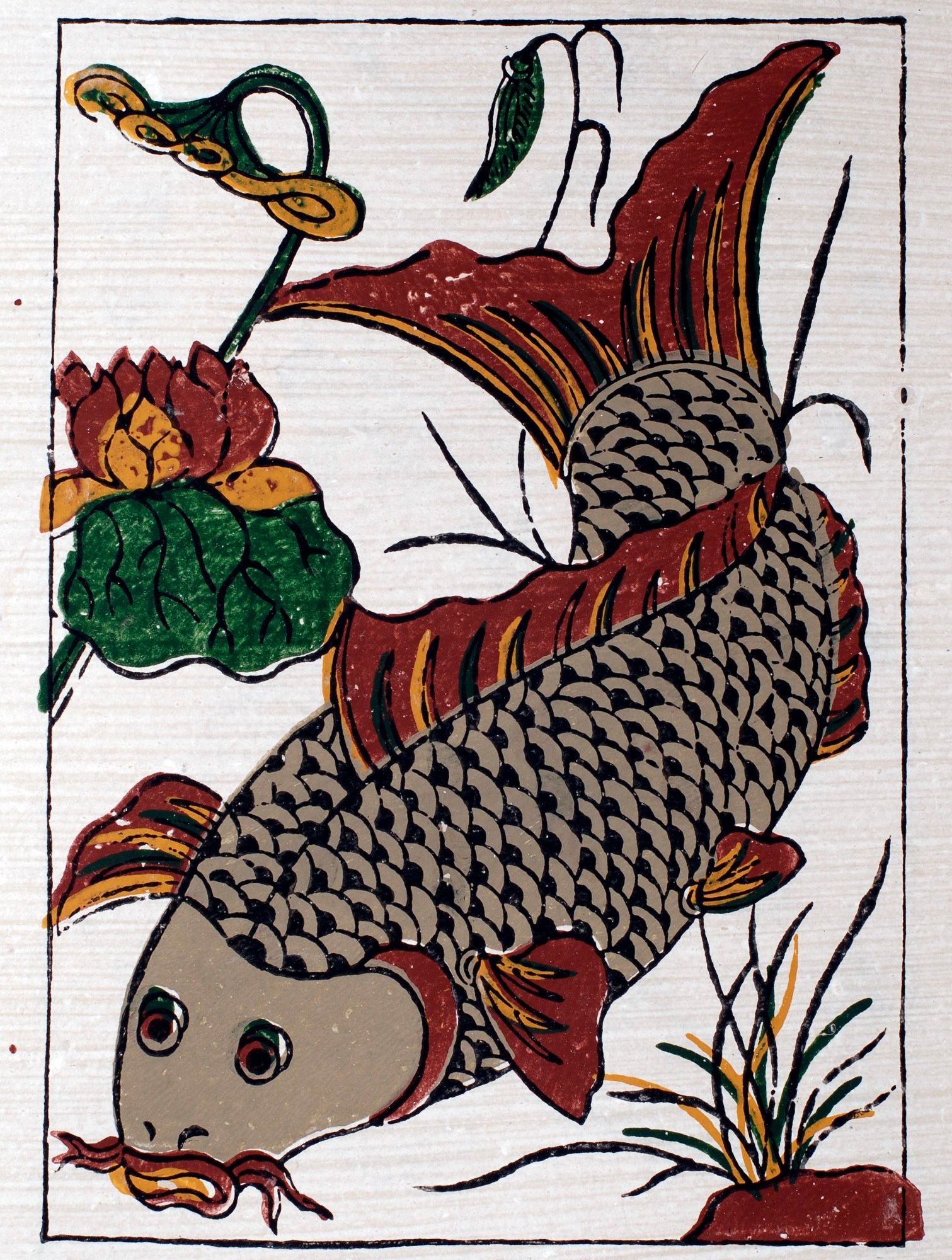 The painting “Carp Looking At the Moon” (Lý ngư vọng nguyệt) shows the desire to succeed in study, fame, and career. The desire for the image of a carp comes from the belief in folklore that a carp crossing the heaven gate will turn into a dragon, like a student overcoming difficulties to achieve success.