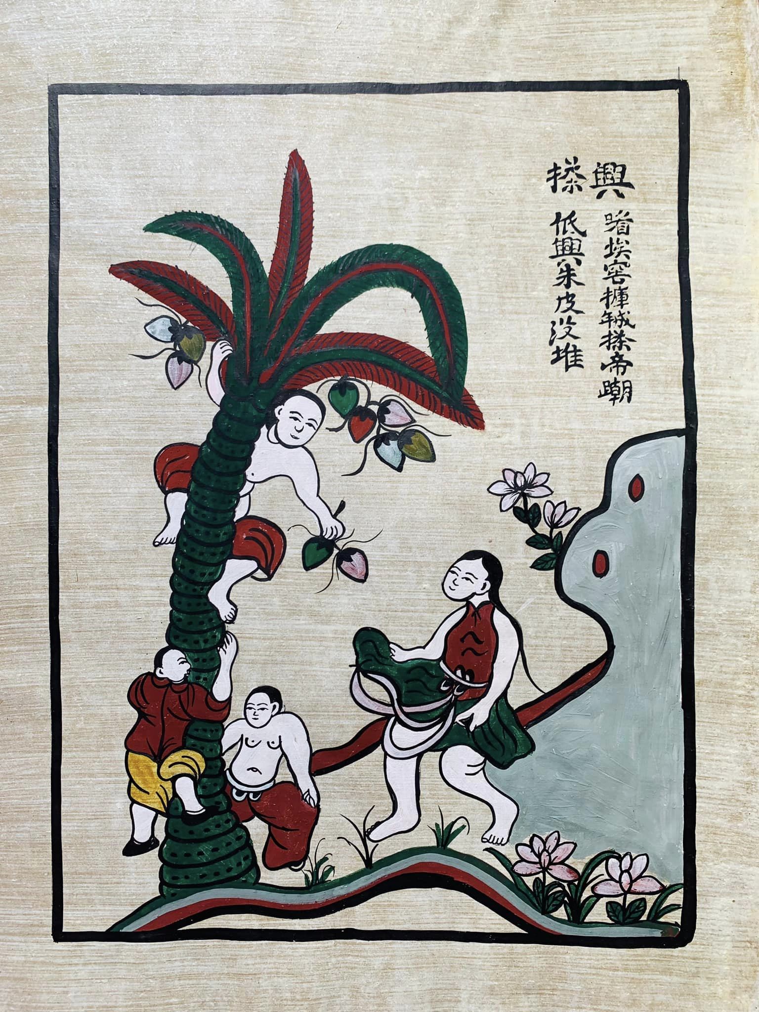 The painting expresses the concept of a happy family in a country including a wife, a husband and two children. The husband with the difficult job is to climb up the coconut trees as breadwinner , who has a career and bravely overcomes all the challenges. The wife is picking coconut as the rear, who always supports her husband when necessary. In the painting, she does not use the hand but the skirt to pick up the coconut, which makes the scene funnier. The children cling to the tree as if they want to share the hard work or to imitate the father overcoming all dangers.