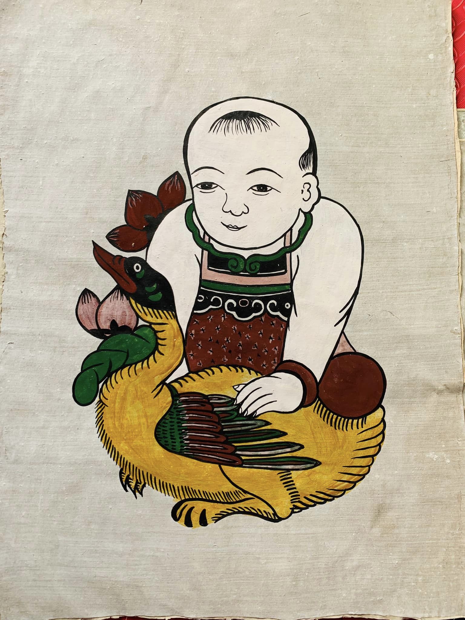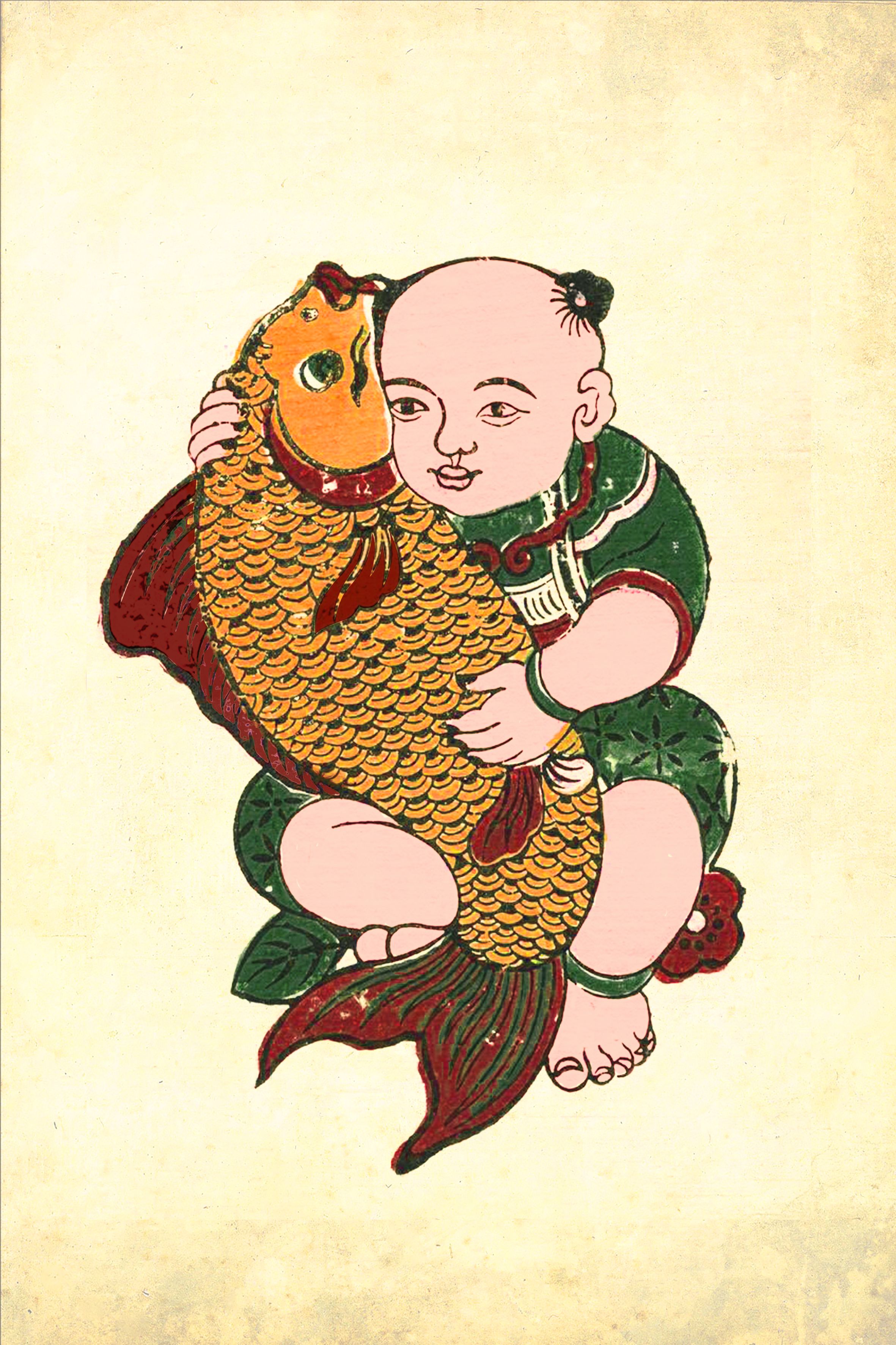 “Baby hugging a carp” (Em bé ôm cá chép) represents the joy of holding a plump carp in the new year. The image of Fish in Vietnamese folk culture symbolizes letters, learning and career advancement. Besides, Carp is not only a symbol of education and fame. It is also a symbol of a rich, prosperous, and abundant life. Paintings are often hung during Tet.