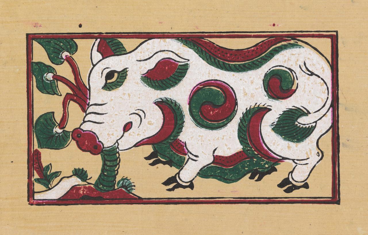 The “Pig eating taro leaf” (Lợn ăn cây ráy) painting express simple dreams of the country people. They work hard to grow the pigs, and they want their pigs to grow big, fat and fast. The image of a pig can be used as a symbol of financial wellness.