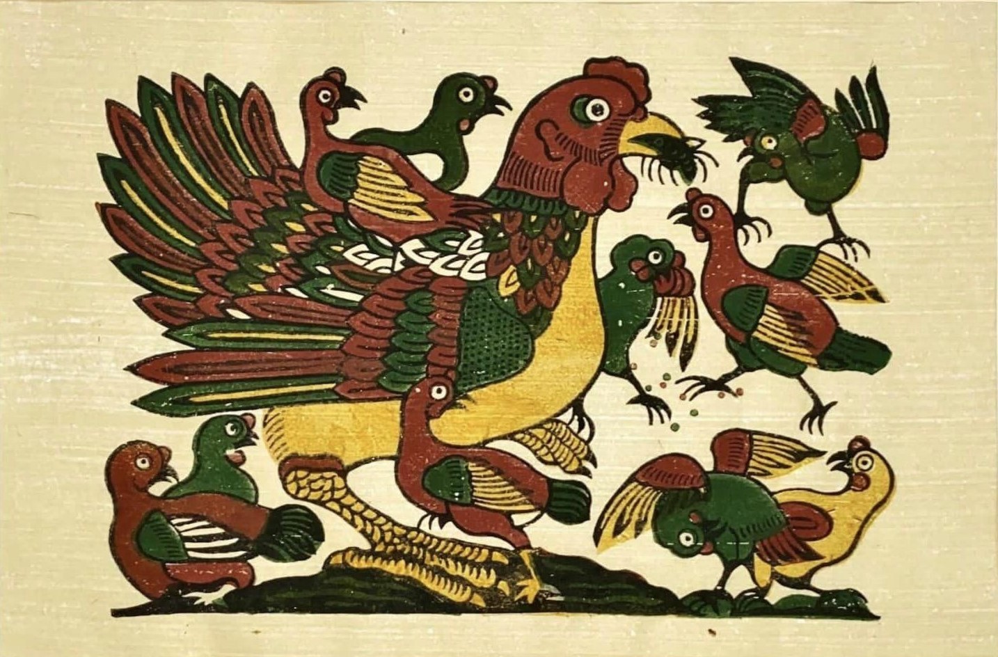 The painting features a hen surrounded by ten baby chickens, each is different in the gesture and posture but all are very playful and energetic. The principal hue of the artwork is made up of warm colors, making it brighter with a sky full of sunlight. The painting stands for the farmer’s dream of fertility and happy families.