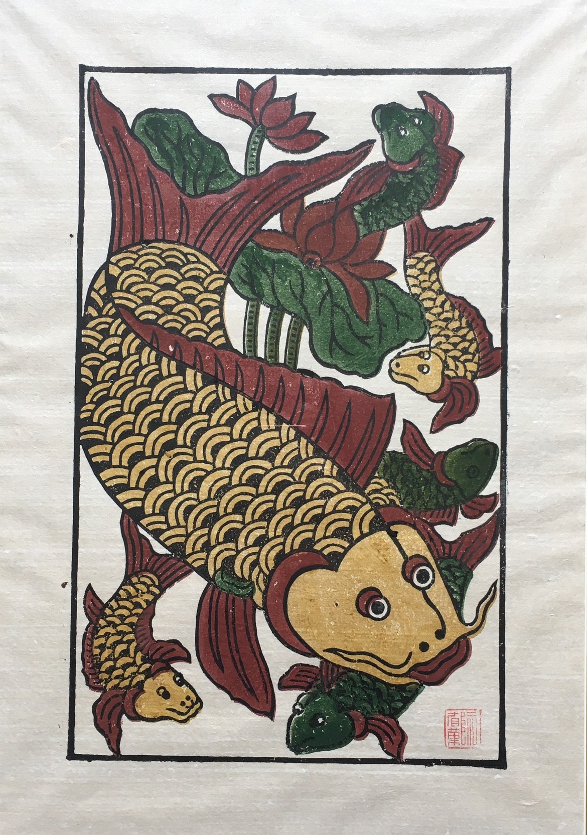 It is a popular painting during the Tet Holiday, which represents the wish of good luck and fortune. In the Oriental culture, legend has it that carp are capable of jumping over the Dragon Gate to transform into dragons. Thus, carp is a symbol of supreme effort, fortune, success and hope.