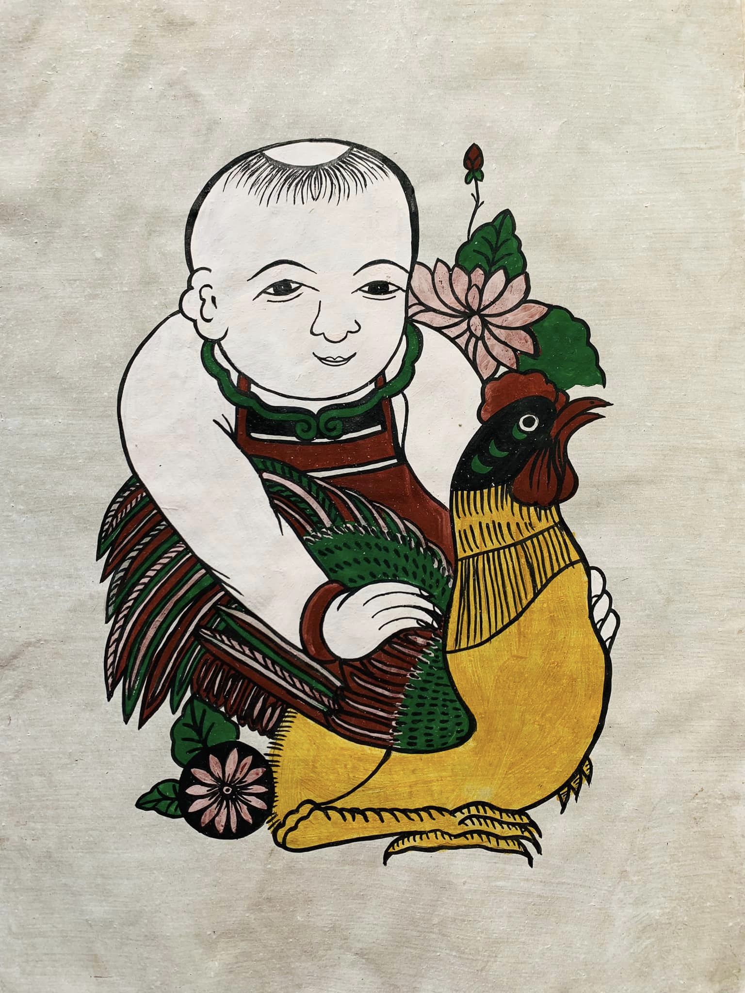 A plump boy holds a rooster with a pot of chrysanthemums blooming behind him expressing the wish to procreate, the wish to give birth to a healthy boy. Later, when he grows up, he will become a successful and glorious person. And has all 5 precious qualities is Humanity - Righteousness - Ceremony - Wisdom - Trust.
