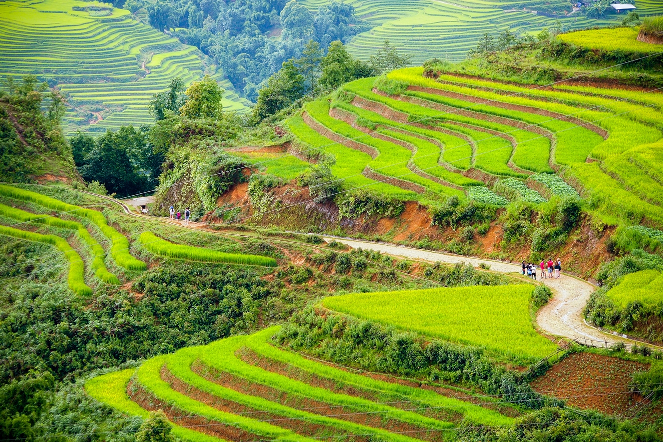 Visiting Sapa, tourists are impressed by the local villages, where ethnic minorities such as Red Dao, Black H'mong, Giay and other ethnic minority groups live. Hiking and trekking are accessible to almost everyone. Day hikes will take you past women working on amid the rice harvest, friendly children on the road, and enchanting rice terraces snaking up the hillsides. For the more adventurous, multi-day trips can also be easily arranged, highlighted by climbing Mount Fansipan, Vietnam's highest peak.